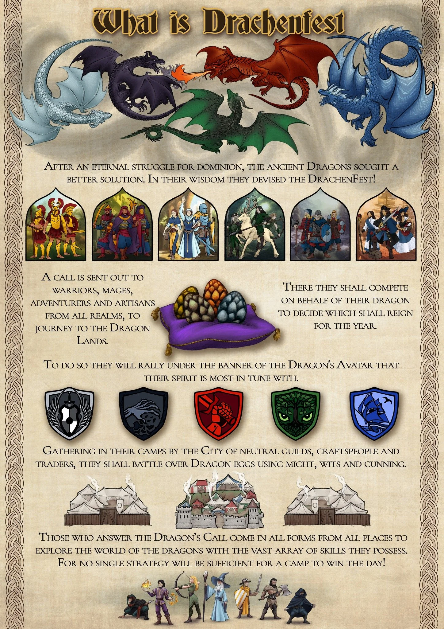 DrachenFest is a blockbuster Live Action Roleplay Event from Germany, which has been running for over 20 years. It is a player-driven, festival-style game that takes place in a medieval fantasy setting where you can explore, fight, celebrate and enjoy the spectacle as you take part in a living world. Player spend three days battling on behalf of the dragon that they decide aligns most closely with their goals and values.